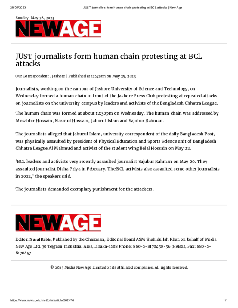 JUST journalists form human chain protesting at BCL attacks _ New Age Published on 25 May 2023 Newspaper New Age Category Campus Terrorism Download