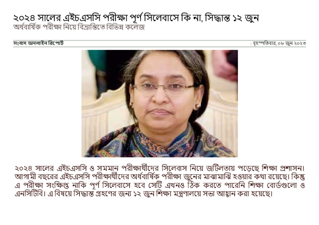 ২০২৪ সালের এইচএসসি পরীক্ষা পূর্ণ সিলেবাসে কি না, সিদ্ধান্ত ১২ জুন _ সংবাদ অনলাইন.pdf Published on 08 June 2023 Newspaper দৈনিক সংবাদ Category Educational Ministry / Departments Public Examination HSC Download