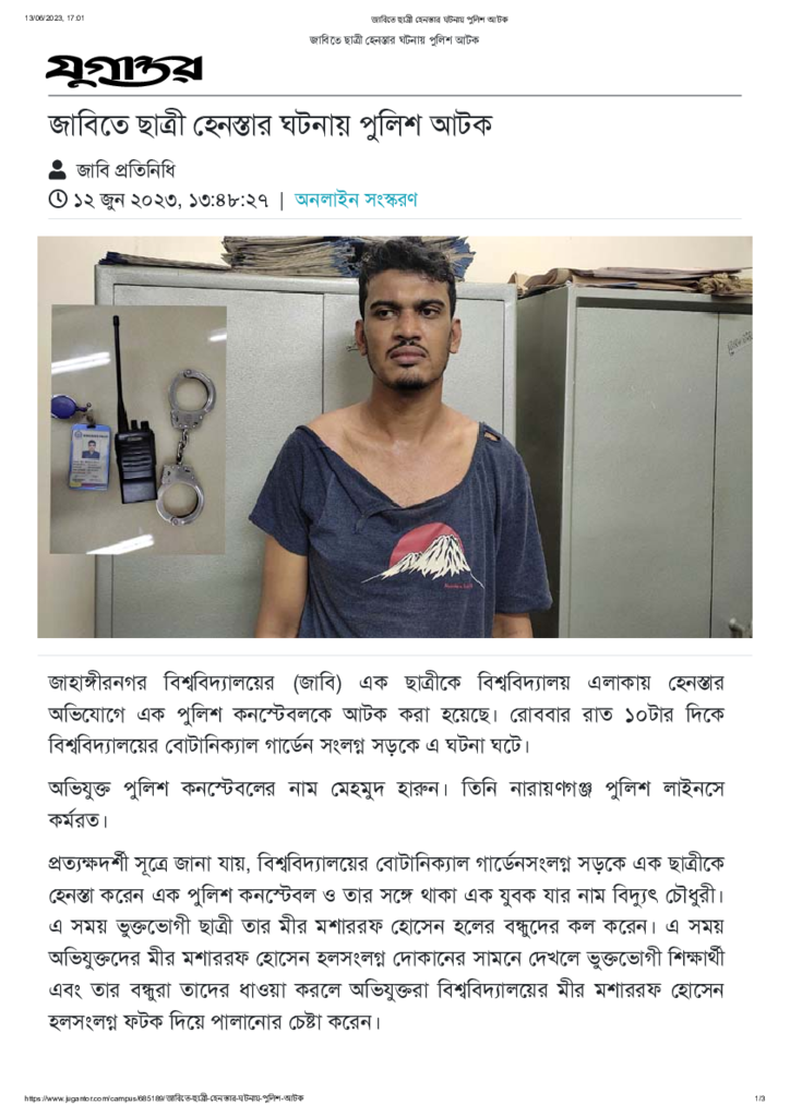 জাবিতে ছাত্রী হেনস্তার ঘটনায় পুলিশ আটক Published on 12 June 2023 Newspaper দৈনিক যুগান্তর Category Campus Terrorism Download
