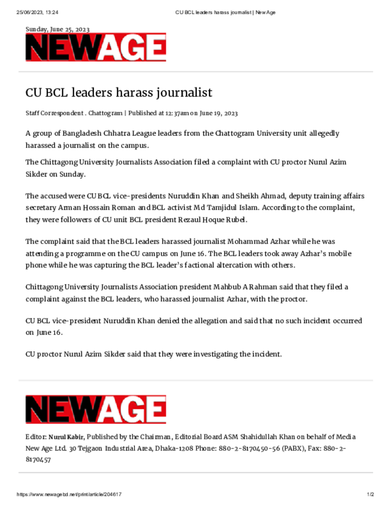 CU BCL leaders harass journalist _ New Age Published on 19 June 2023 Newspaper New Age Category Campus Terrorism Download