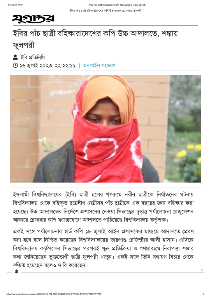 ইবির পাঁচ ছাত্রী বহিষ্কারাদেশের কপি উচ্চ আদালতে, শঙ্কায় ফুলপরী Published on 16 July 2023 Newspaper দৈনিক যুগান্তর Category Campus Terrorism Download