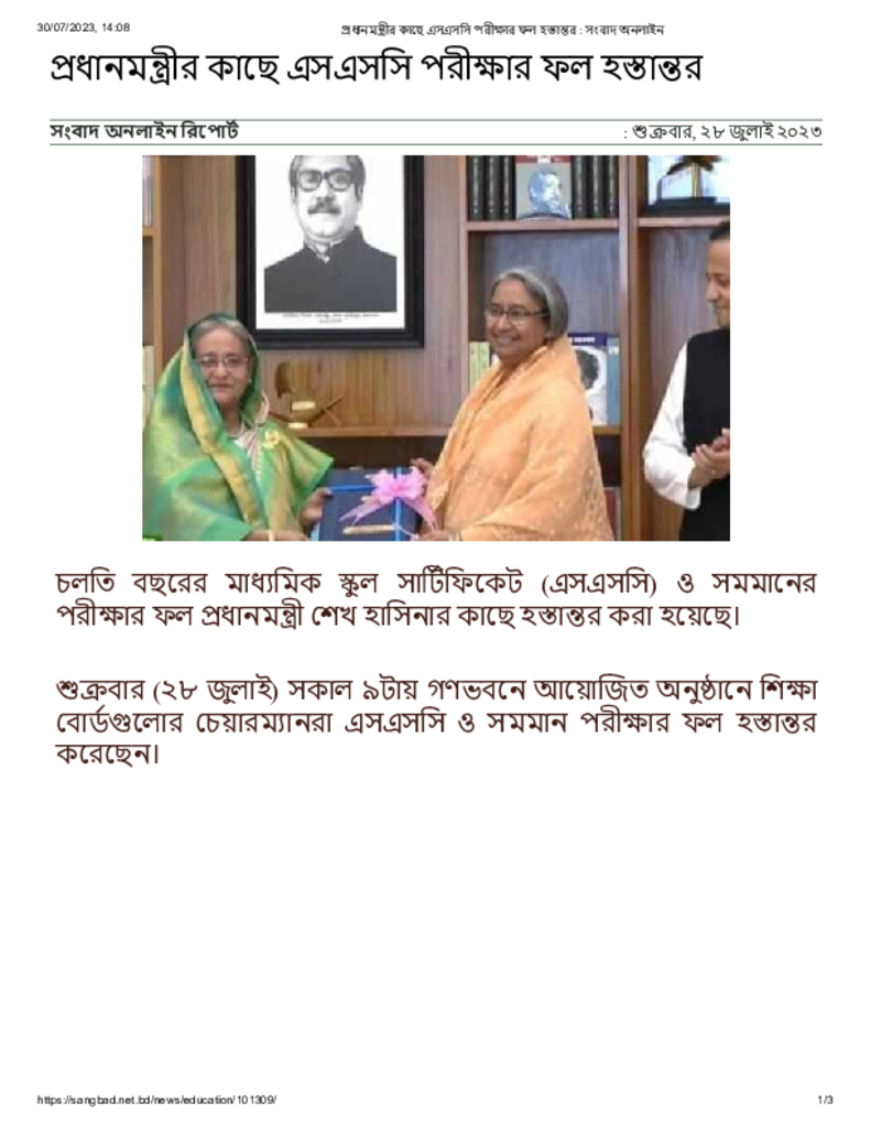 প্রধানমন্ত্রীর কাছে এসএসসি পরীক্ষার ফল হস্তান্তর _ সংবাদ অনলাইন Published on 28 July 2023 Newspaper দৈনিক সংবাদ Category Public Examination Public Examination SSC Download