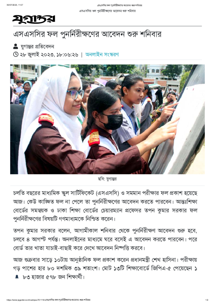এসএসসির ফল পুনর্নিরীক্ষণের আবেদন শুরু শনিবার Published on 28 July 2023 Newspaper দৈনিক যুগান্তর Category Public Examination Download