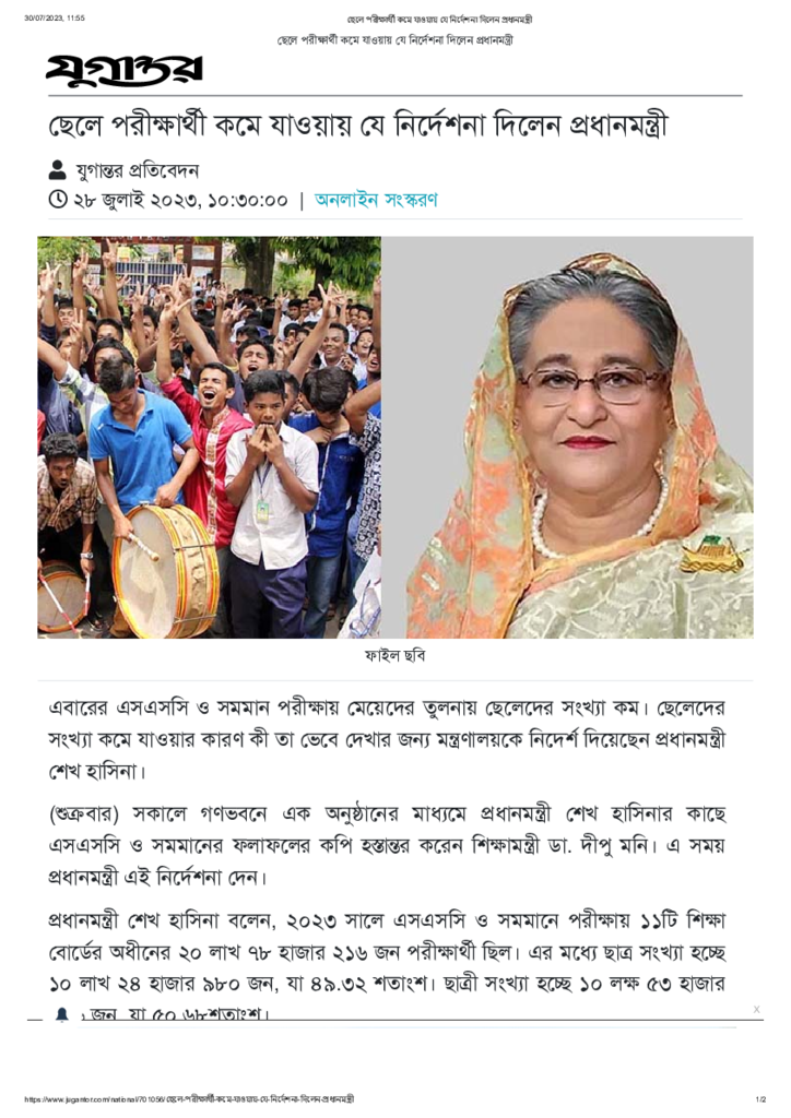 ছেলে পরীক্ষার্থী কমে যাওয়ায় যে নির্দেশনা দিলেন প্রধানমন্ত্রী Published on 28 July 2023 Newspaper দৈনিক যুগান্তর Category Public Examination Download