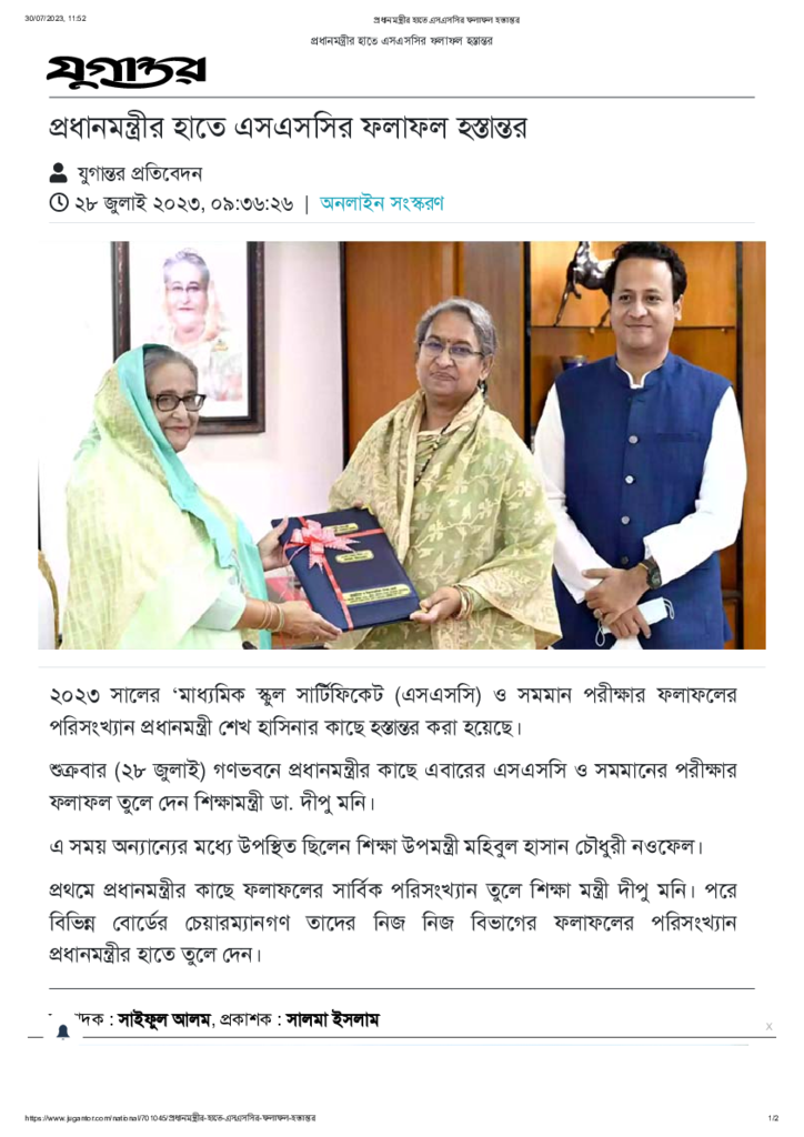 প্রধানমন্ত্রীর হাতে এসএসসির ফলাফল হস্তান্তর Published on 28 July 2023 Newspaper দৈনিক যুগান্তর Category Public Examination Download
