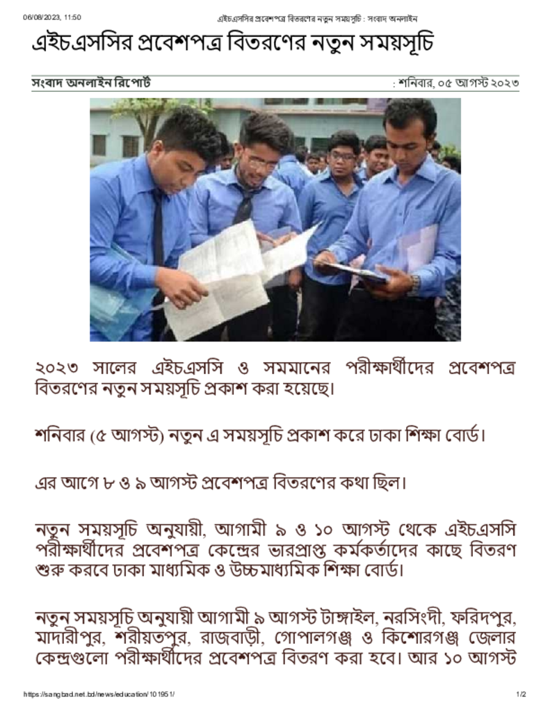 এইচএসসির প্রবেশপত্র বিতরণের নতুন সময়সূচি _ সংবাদ অনলাইন Published on 05 August 2023 Newspaper দৈনিক সংবাদ Category Public Examination Public Examination HSC Download