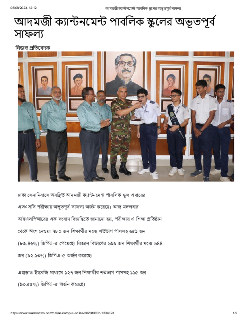 আদমজী ক্যান্টনমেন্ট পাবলিক স্কুলের অভূতপূর্ব সাফল্য Published on 01 August 2023 Newspaper দৈনিক কালের কন্ঠ Category Public Examination Public Examination SSC Download