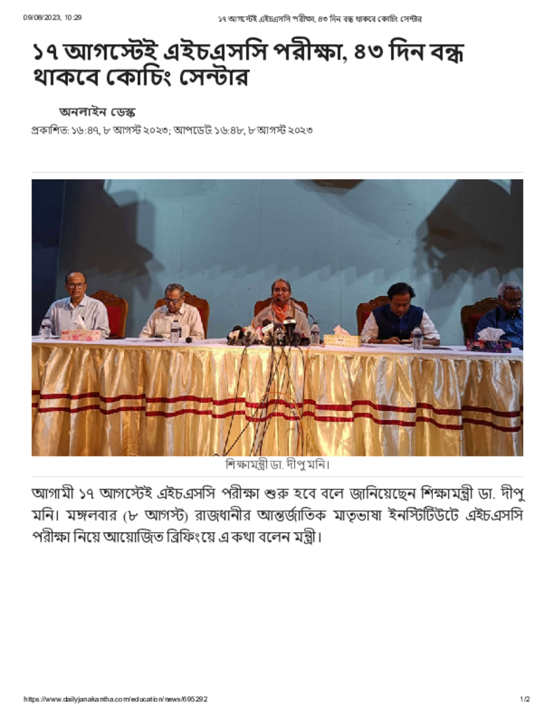 ১৭ আগস্টেই এইচএসসি পরীক্ষা, ৪৩ দিন বন্ধ থাকবে কোচিং সেন্টার Published on 08 August 2023 Newspaper দৈনিক জনকণ্ঠ Category Educational Ministry / Departments Public Examination HSC Download