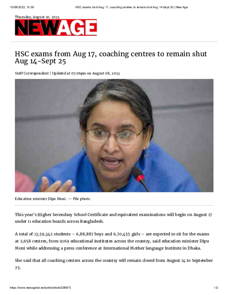 HSC exams from Aug 17, coaching centres to remain shut Aug 14-Sept 25 _ New Age