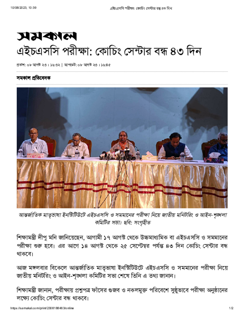 এইচএসসি পরীক্ষা_ কোচিং সেন্টার বন্ধ ৪৩ দিন Published on 08 August 2023 Newspaper দৈনিক সমকাল Category Public Examination Download