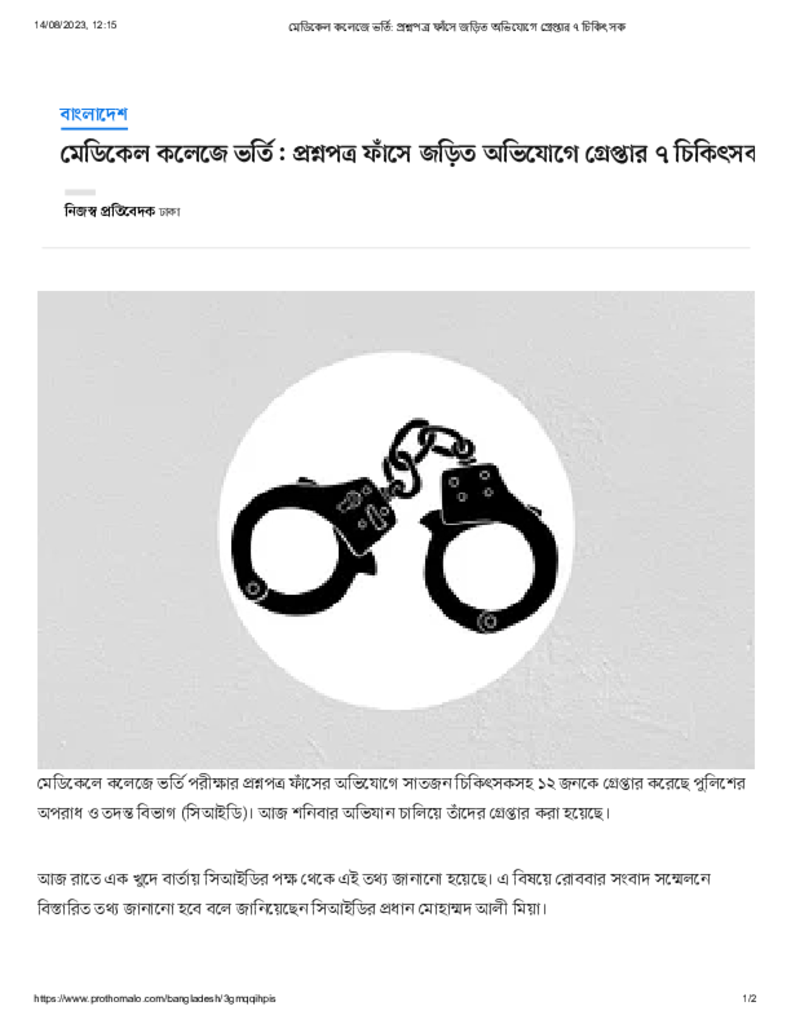 মেডিকেল কলেজে ভর্তি_ প্রশ্নপত্র ফাঁসে জড়িত অভিযোগে গ্রেপ্তার ৭ চিকিৎসক Published on 12 August 2023 Newspaper দৈনিক প্রথম আলো Category Professional Education Professional Education Medical Download