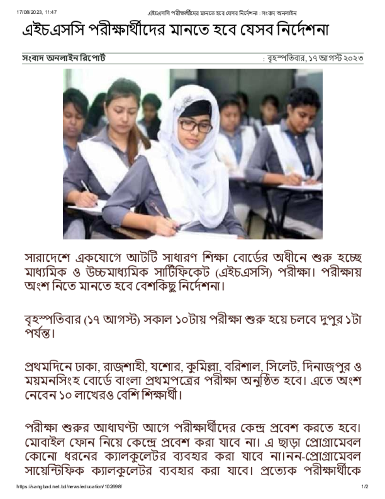 এইচএসসি পরীক্ষার্থীদের মানতে হবে যেসব নির্দেশনা _ সংবাদ অনলাইন Published on 17 August 2023 Newspaper দৈনিক সংবাদ Category Educational Ministry / Departments Public Examination HSC Download