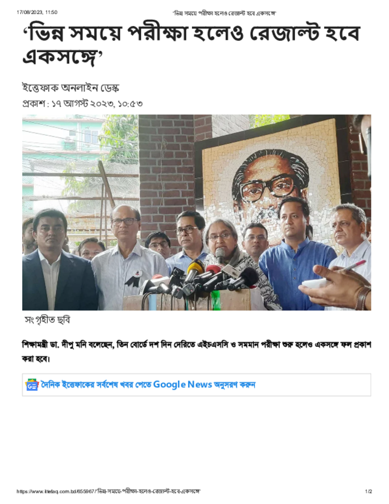 ‘ভিন্ন সময়ে পরীক্ষা হলেও রেজাল্ট হবে একসঙ্গে’ Published on 17 August 2023 Newspaper দৈনিক ইত্তেফাক Category Educational Ministry / Departments Public Examination HSC Download