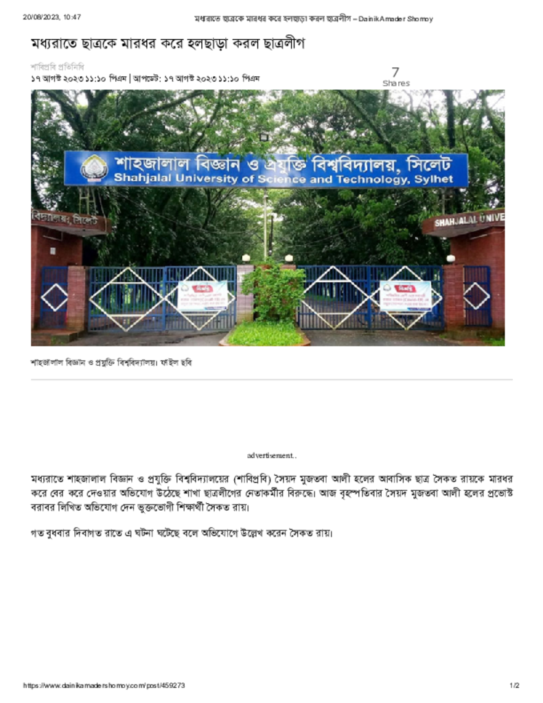 মধ্যরাতে ছাত্রকে মারধর করে হলছাড়া করল ছাত্রলীগ – Dainik Amader Shomoy