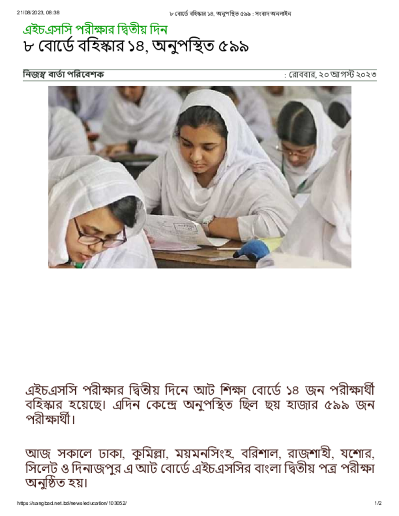 ৮ বোর্ডে বহিস্কার ১৪, অনুপস্থিত ৫৯৯ _ সংবাদ অনলাইন Published on 20 August 2023 Newspaper দৈনিক সংবাদ Category Public Examination Public Examination HSC Download
