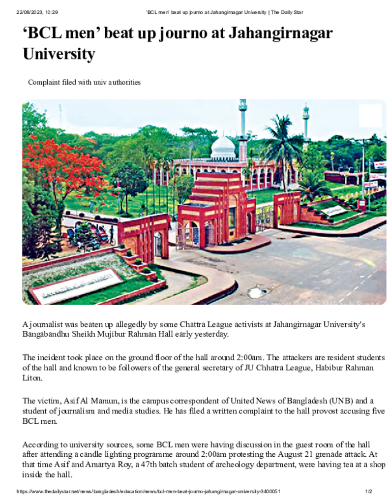 ‘BCL men’ beat up journo at Jahangirnagar University _ The Daily Star Published on 22 August 2023 Newspaper The Daily Star Category Campus Terrorism General Education Download