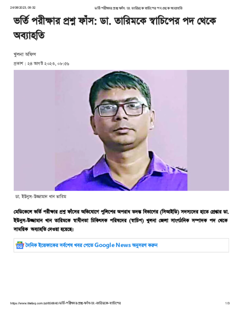 ভর্তি পরীক্ষার প্রশ্ন ফাঁস_ ডা. তারিমকে স্বাচিপের পদ থেকে অব্যাহতি Published on 24 August 2023 Newspaper দৈনিক ইত্তেফাক Category Professional Education Professional Education Medical Download