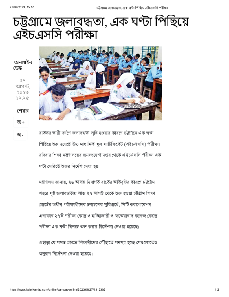 চট্টগ্রামে জলাবদ্ধতা, এক ঘণ্টা পিছিয়ে এইচএসসি পরীক্ষা Published on 27 August 2023 Newspaper দৈনিক কালের কন্ঠ Category Public Examination Public Examination HSC Download