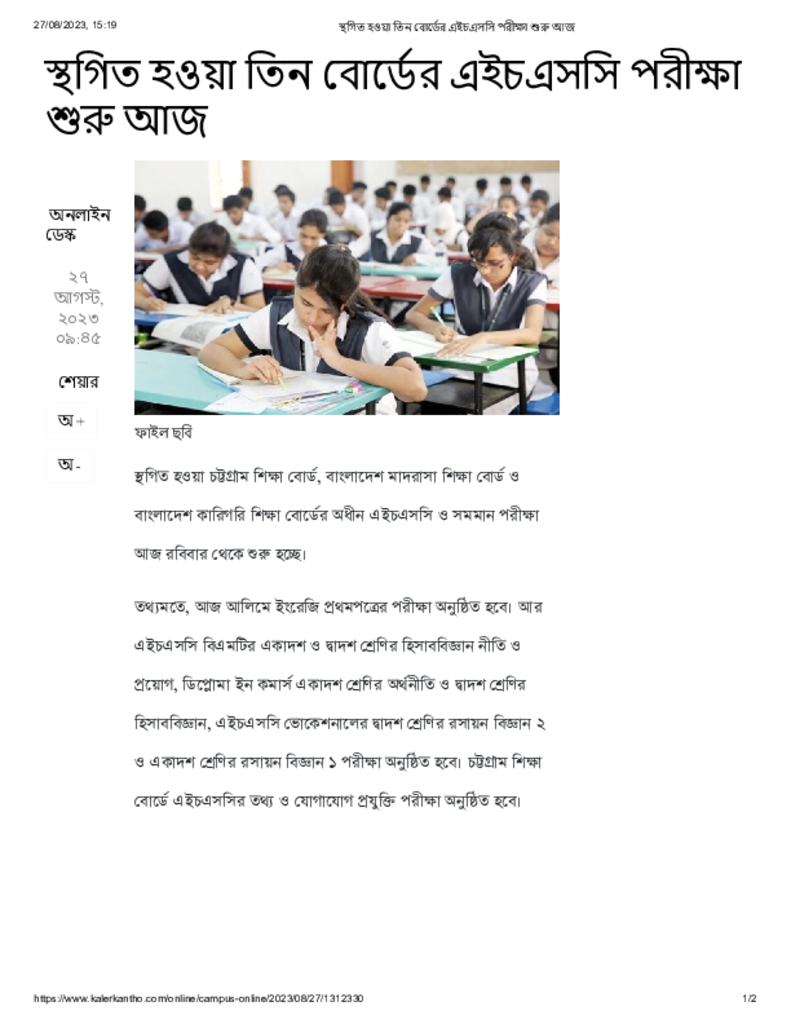 স্থগিত হওয়া তিন বোর্ডের এইচএসসি পরীক্ষা শুরু আজ Published on 27 August 2023 Newspaper দৈনিক কালের কন্ঠ Category Public Examination Public Examination HSC Download