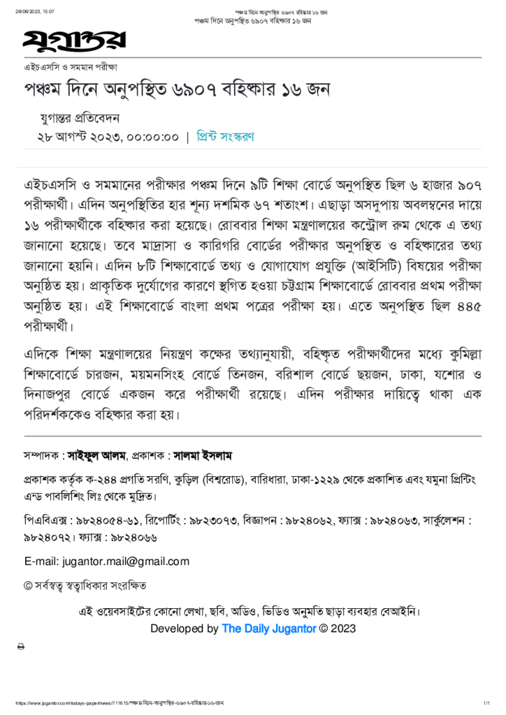 পঞ্চম দিনে অনুপস্থিত ৬৯০৭ বহিষ্কার ১৬ জন Published on 28 August 2023 Newspaper দৈনিক যুগান্তর Category Public Examination Public Examination HSC Download