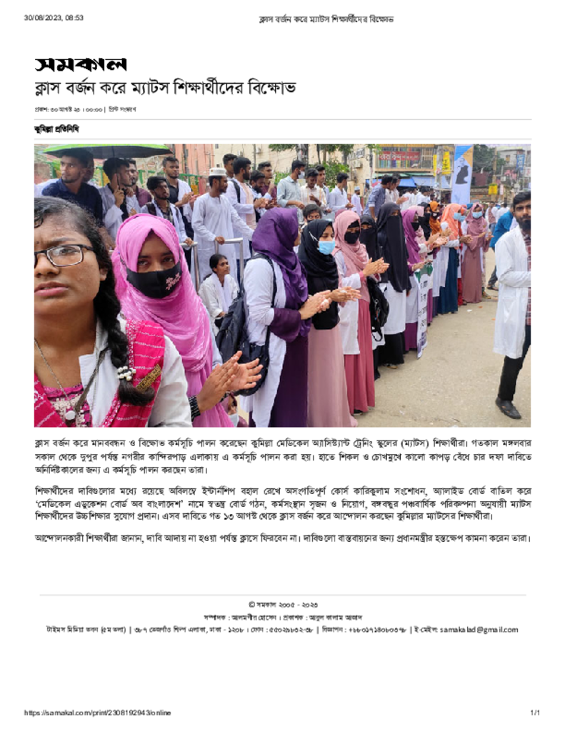 ক্লাস বর্জন করে ম্যাটস শিক্ষার্থীদের বিক্ষোভ Published on 30 August 2023 Newspaper দৈনিক সমকাল Category Professional Education Download