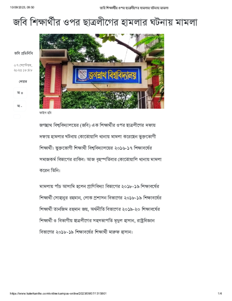 জবি শিক্ষার্থীর ওপর ছাত্রলীগের হামলার ঘটনায় মামলা Published on 07 September 2023 Newspaper দৈনিক কালের কন্ঠ Category Campus Terrorism General Education Download