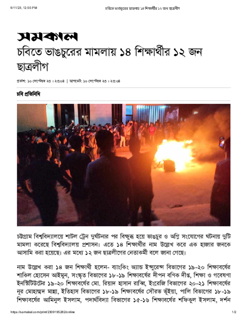 চবিতে ভাঙচুরের মামলায় ১৪ শিক্ষার্থীর ১২ জন ছাত্রলীগ.pdf Published on 10 September 2023 Newspaper দৈনিক সমকাল Category Campus Terrorism General Education Download