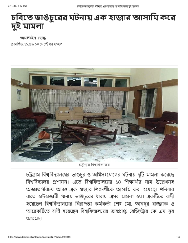 চবিতে ভাঙচুরের ঘটনায় এক হাজার আসামি করে দুই মামলা.pdf Published on 10 September 2023 Newspaper দৈনিক জনকণ্ঠ Category Campus Terrorism Download