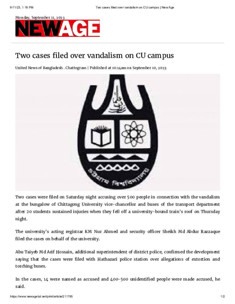 Two cases filed over vandalism on CU campus _ New Age.pdf Published on 11 September 2023 Newspaper New Age Category Campus Terrorism General Education Download