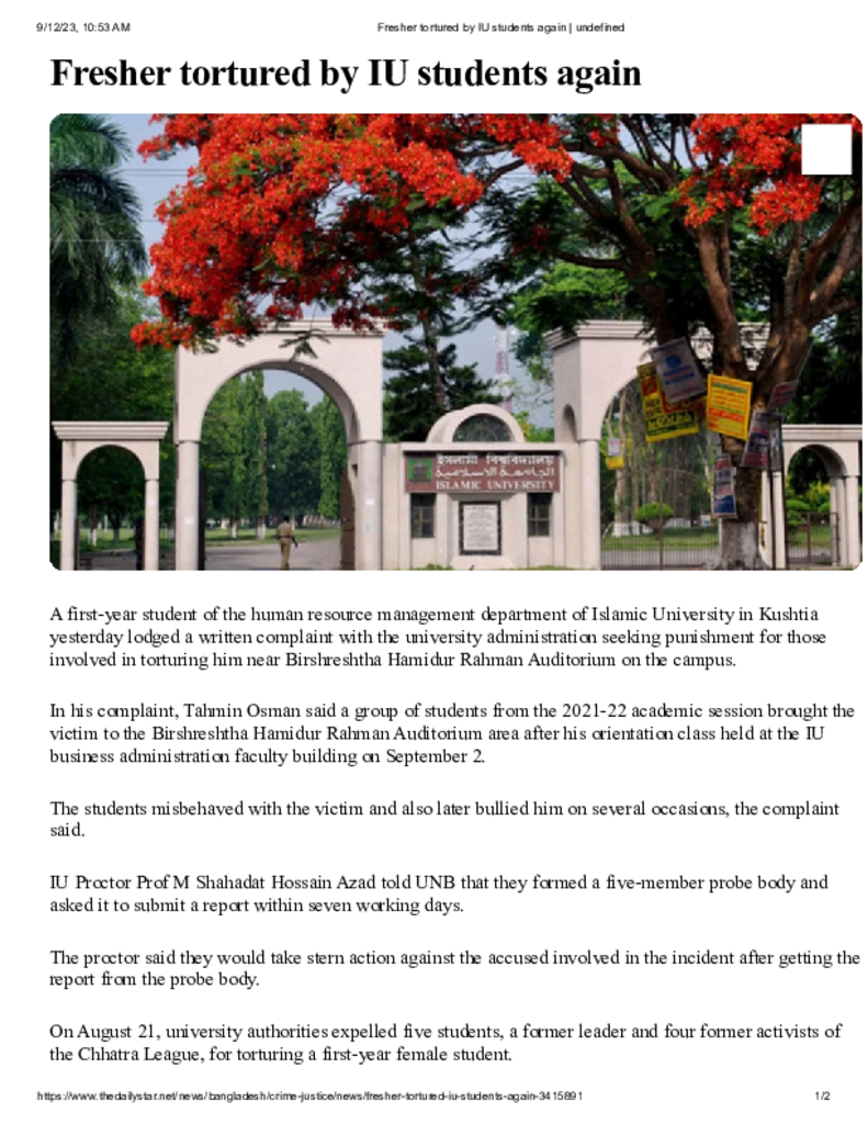 Fresher tortured by IU students again _ undefined.pdf Published on 11 September 2023 Newspaper The Daily Star Category Campus Terrorism General Education Download