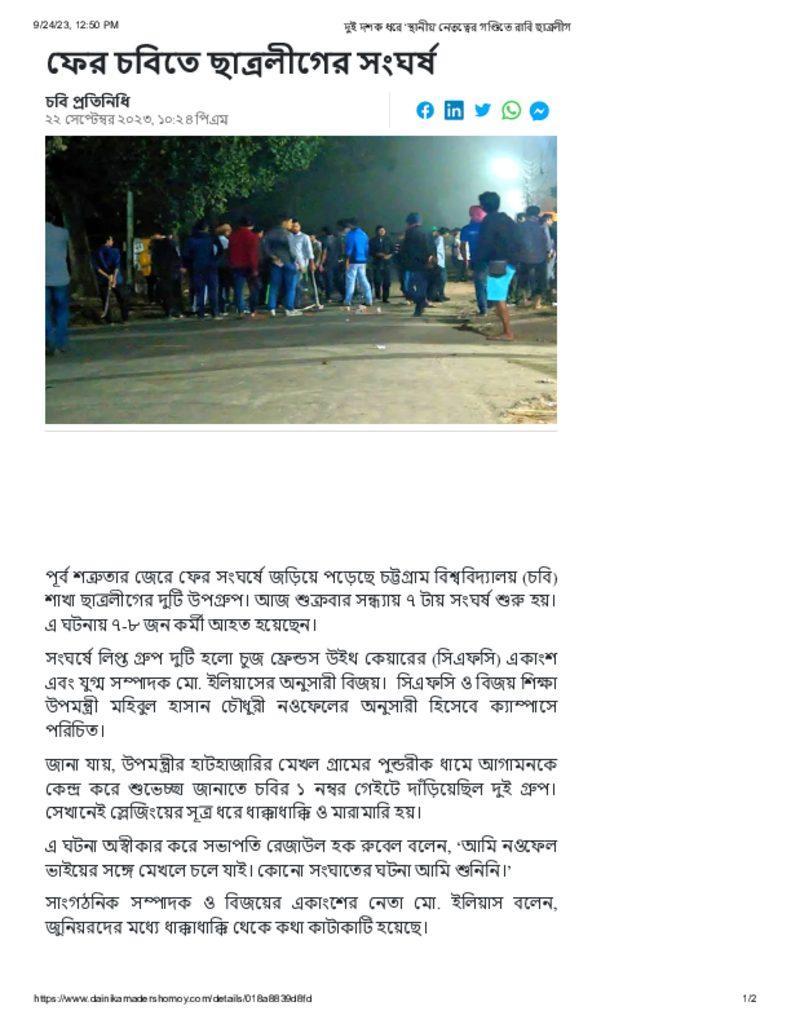 ফের চবিতে ছাত্রলীগের সংঘর্ষ Published on 22 September 2023 Newspaper দৈনিক আমাদের সময় Category Campus Terrorism General Education Download