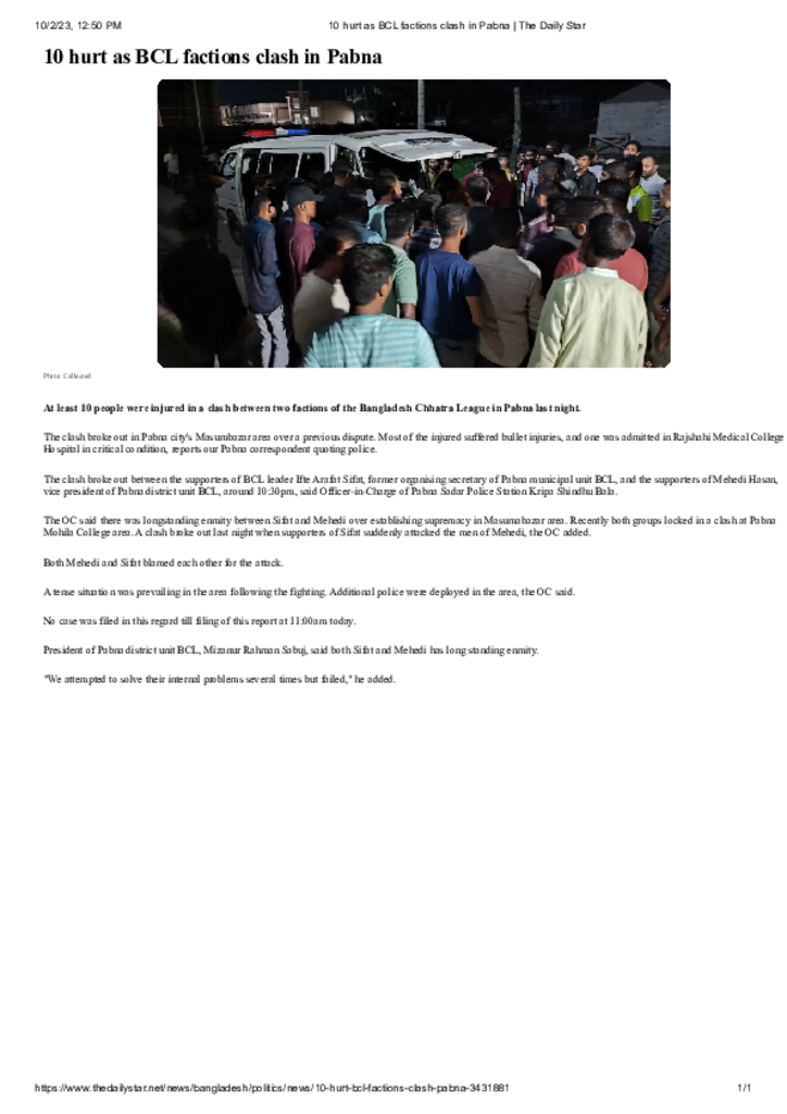 10 hurt as BCL factions clash in Pabna Published on 02 October 2023 Newspaper The Daily Star Category Campus Terrorism General Education Download