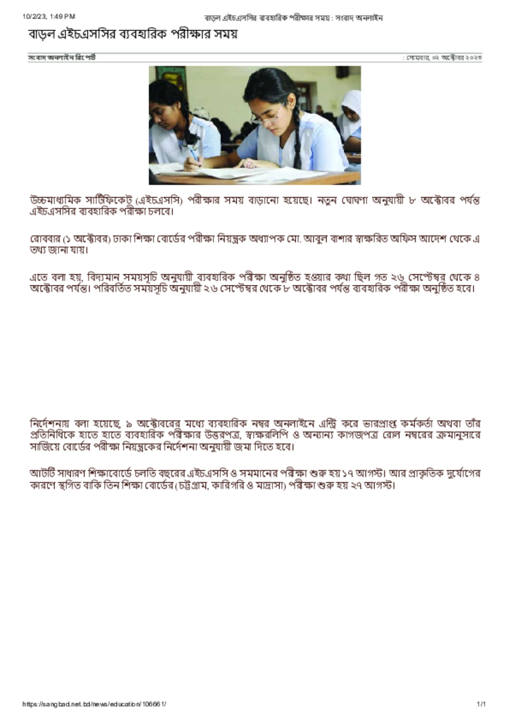 বাড়ল এইচএসসির ব্যবহারিক পরীক্ষার সময় Published on 02 October 2023 Newspaper দৈনিক সংবাদ Category Public Examination Public Examination HSC Download