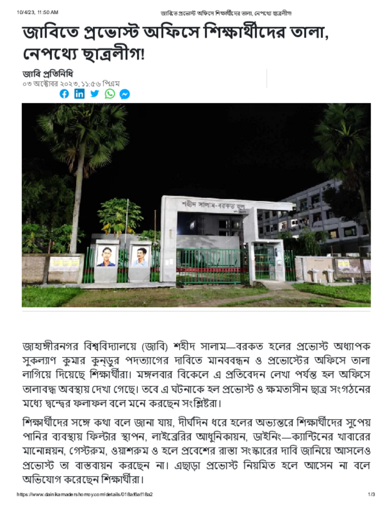 জাবিতে প্রভোস্ট অফিসে শিক্ষার্থীদের তালা, নেপথ্যে ছাত্রলীগ! Published on 03 October 2023 Newspaper দৈনিক আমাদের সময় Category Campus Terrorism General Education Download