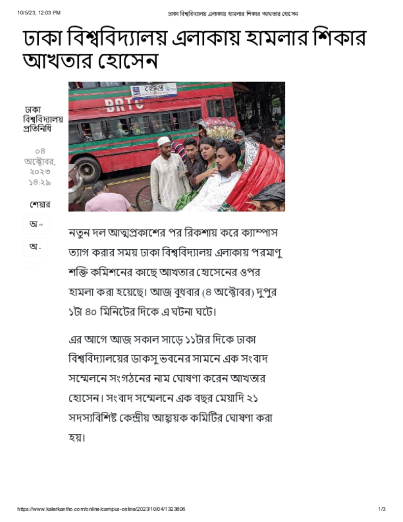 ঢাকা বিশ্ববিদ্যালয় এলাকায় হামলার শিকার আখতার হোসেন Published on 04 October 2023 Newspaper দৈনিক কালের কন্ঠ Category Campus Terrorism General Education Download