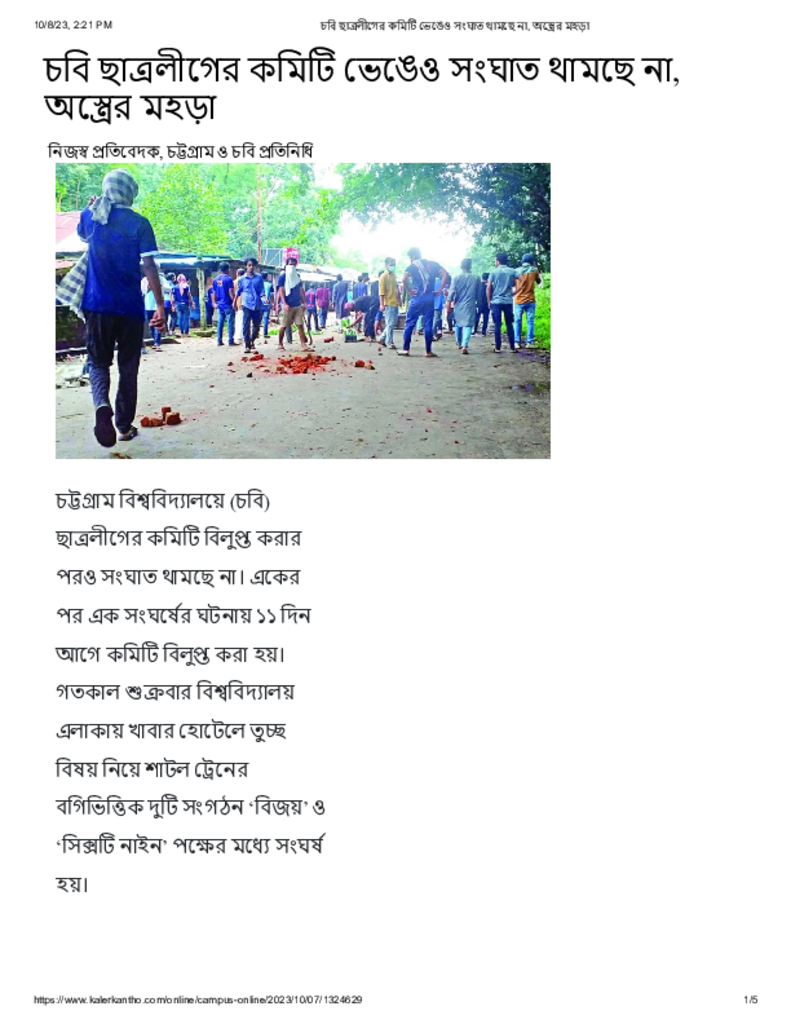 চবি ছাত্রলীগের কমিটি ভেঙেও সংঘাত থামছে না, অস্ত্রের মহড়া.pdf Published on 07 October 2023 Newspaper দৈনিক কালের কন্ঠ Category Campus Terrorism General Education Higher Education Public Download