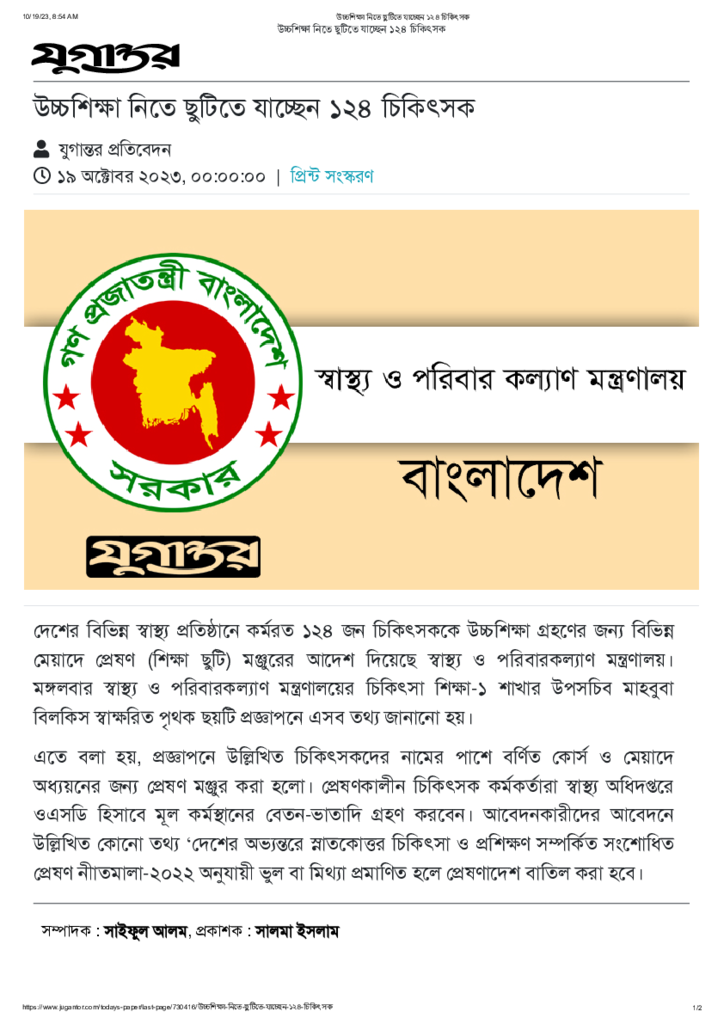 উচ্চশিক্ষা নিতে ছুটিতে যাচ্ছেন ১২৪ চিকিৎসক.pdf Published on 19 October 2023 Newspaper দৈনিক যুগান্তর Category Professional Education General Education Professional Education Medical Download