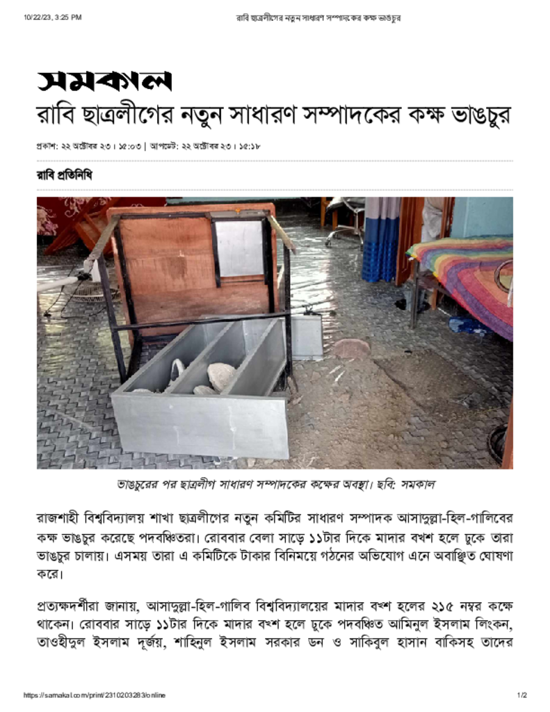 রাবি ছাত্রলীগের নতুন সাধারণ সম্পাদকের কক্ষ ভাঙচুর Published on 22 October 2023 Newspaper দৈনিক সমকাল Category Campus Terrorism General Education Download