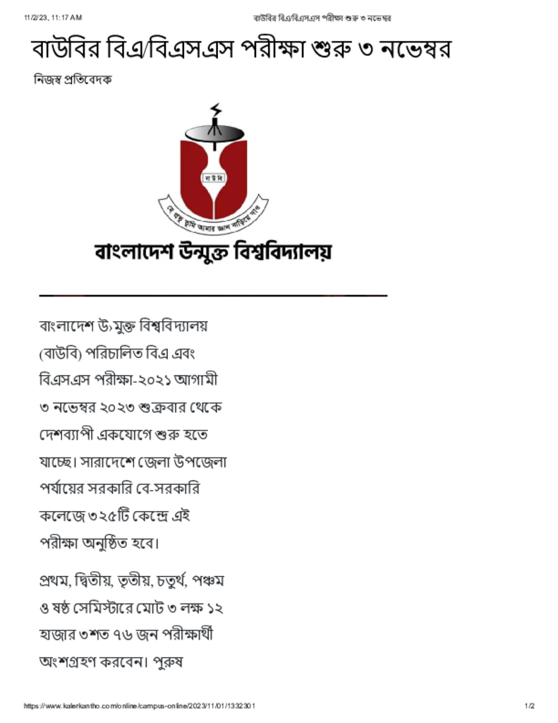 বাউবির বিএ_বিএসএস পরীক্ষা শুরু ৩ নভেম্বর.pdf Published on 01 November 2023 Newspaper দৈনিক কালের কন্ঠ Category Public Examination General Education Download