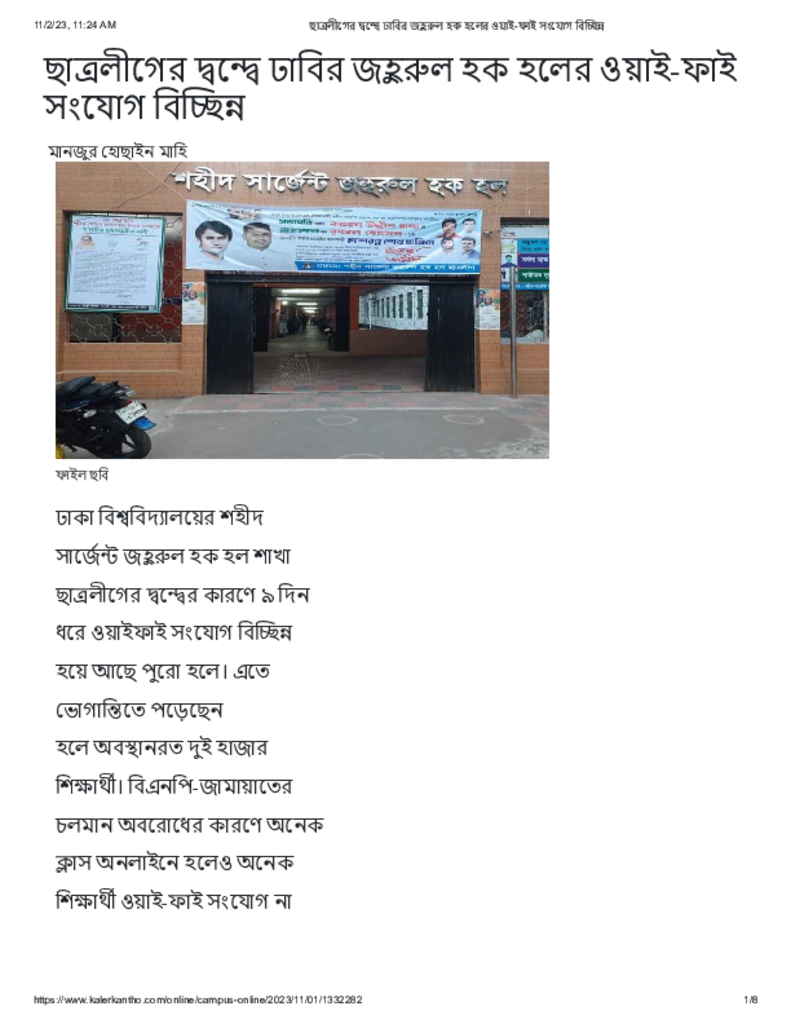ছাত্রলীগের দ্বন্দ্বে ঢাবির জহুরুল হক হলের ওয়াই-ফাই সংযোগ বিচ্ছিন্ন.pdf Published on 01 November 2023 Newspaper দৈনিক কালের কন্ঠ Category Campus Terrorism General Education Download