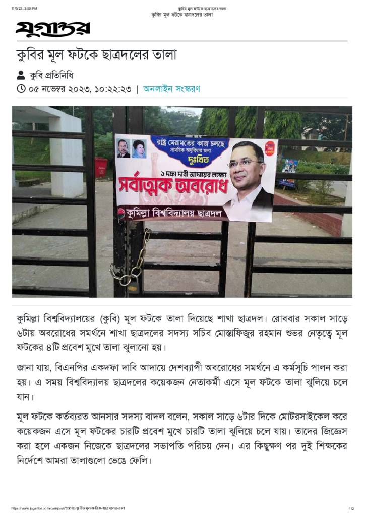 কুবির মূল ফটকে ছাত্রদলের তালা Published on 05 November 2023 Newspaper দৈনিক যুগান্তর Category Campus Terrorism General Education Download
