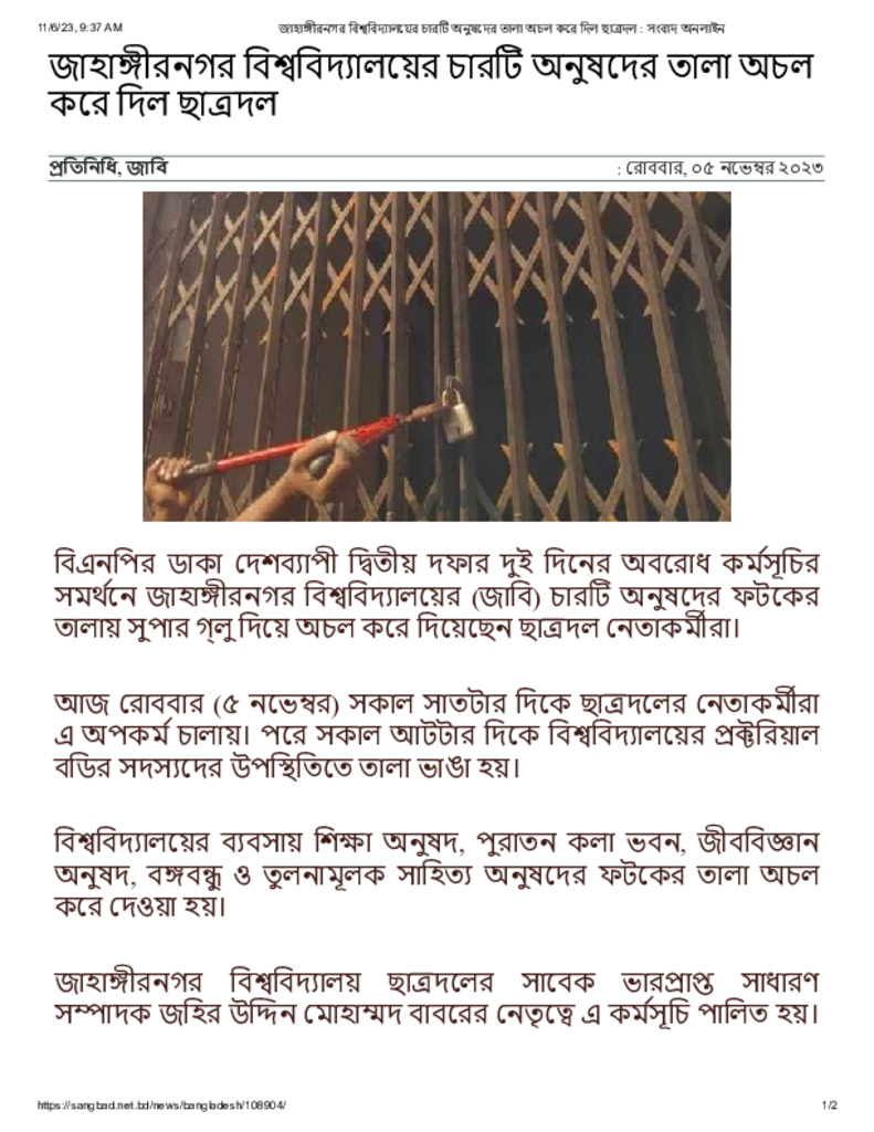 জাহাঙ্গীরনগর বিশ্ববিদ্যালয়ের চারটি অনুষদের তালা অচল করে দিল ছাত্রদল _ সংবাদ অনলাইন Published on 05 November 2023 Newspaper দৈনিক সংবাদ Category Campus Terrorism General Education Download