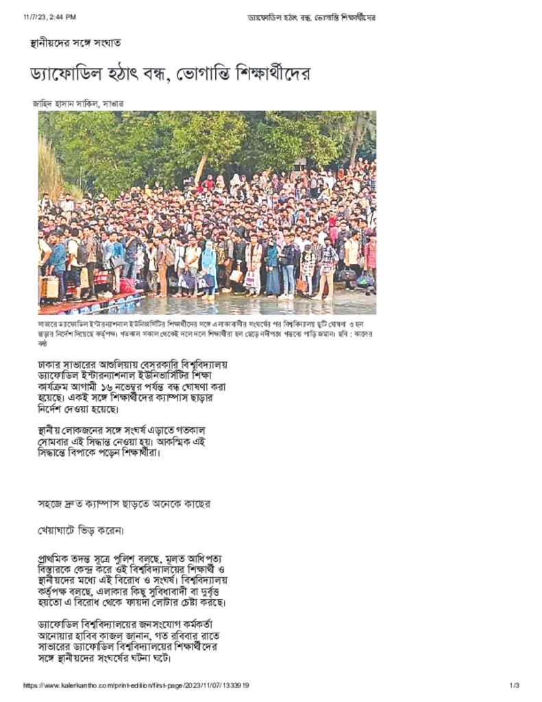 ড্যাফোডিল হঠাৎ বন্ধ, ভোগান্তি শিক্ষার্থীদের Published on 07 November 2023 Newspaper দৈনিক কালের কন্ঠ Category Campus Terrorism General Education Download