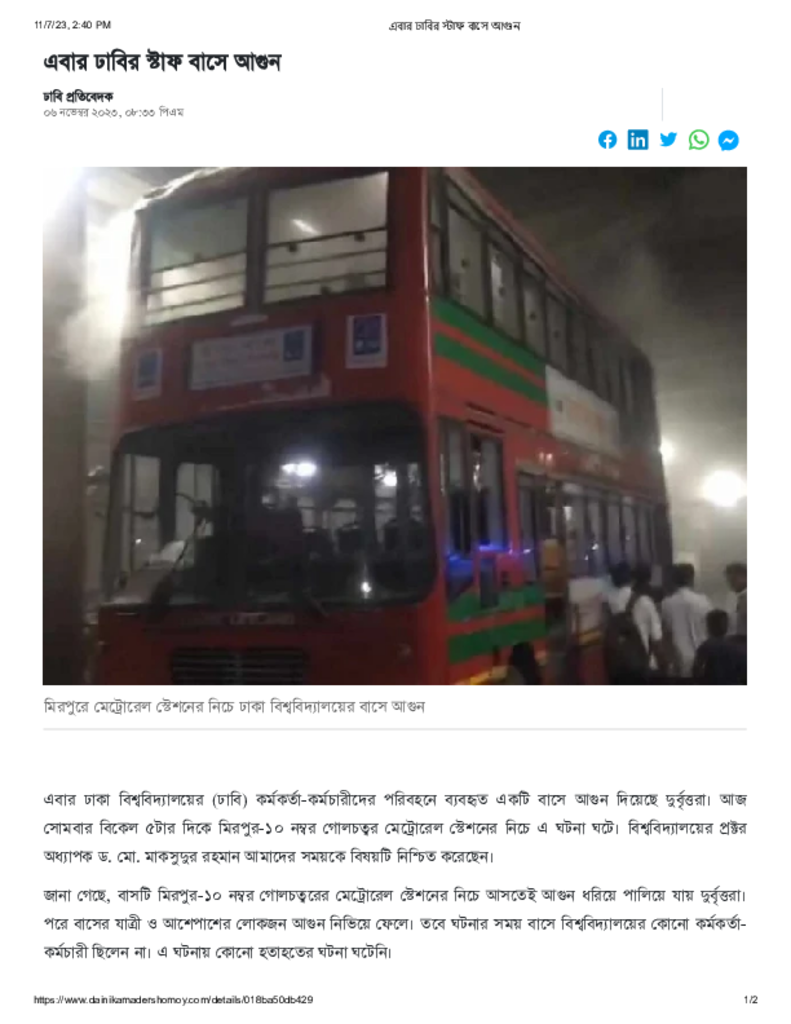 এবার ঢাবির স্টাফ বাসে আগুন Published on 07 November 2023 Newspaper দৈনিক আমাদের সময় Category Campus Terrorism General Education Download