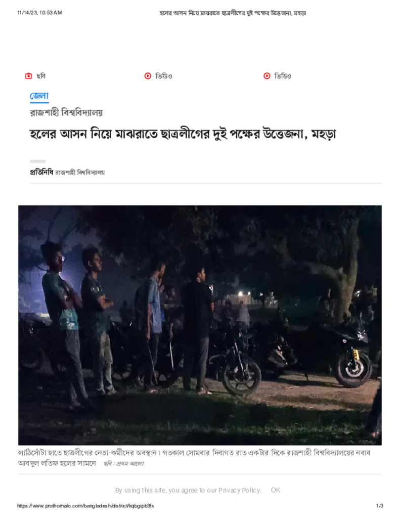 হলের আসন নিয়ে মাঝরাতে ছাত্রলীগের দুই পক্ষের উত্তেজনা, মহড়া Published on 14 November 2023 Newspaper দৈনিক প্রথম আলো Category Campus Terrorism General Education Download