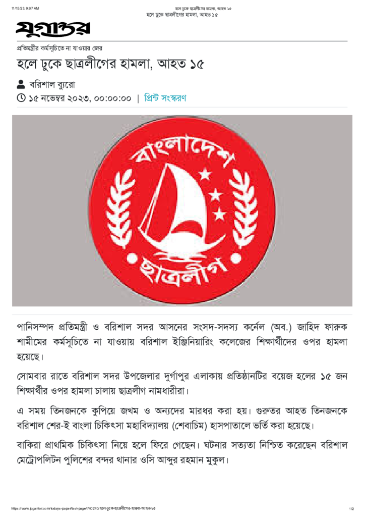 হলে ঢুকে ছাত্রলীগের হামলা, আহত ১৫ Published on 15 November 2023 Newspaper দৈনিক যুগান্তর Category Campus Terrorism General Education Download
