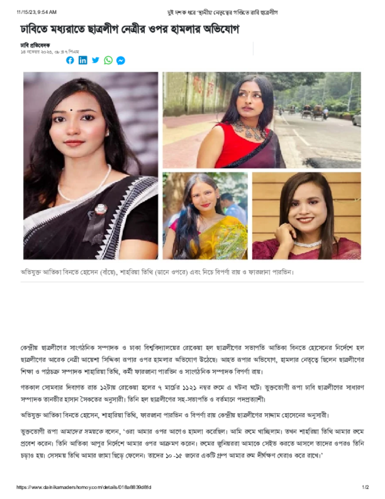 ঢাবিতে মধ্যরাতে ছাত্রলীগ নেত্রীর ওপর হামলার অভিযোগ Published on 15 November 2023 Newspaper দৈনিক আমাদের সময় Category Campus Terrorism General Education Download