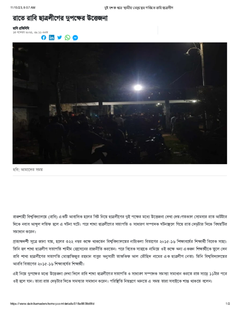 রাতে রাবি ছাত্রলীগের দুপক্ষের উত্তেজনা Published on 14 November 2023 Newspaper দৈনিক আমাদের সময় Category Campus Terrorism General Education Download