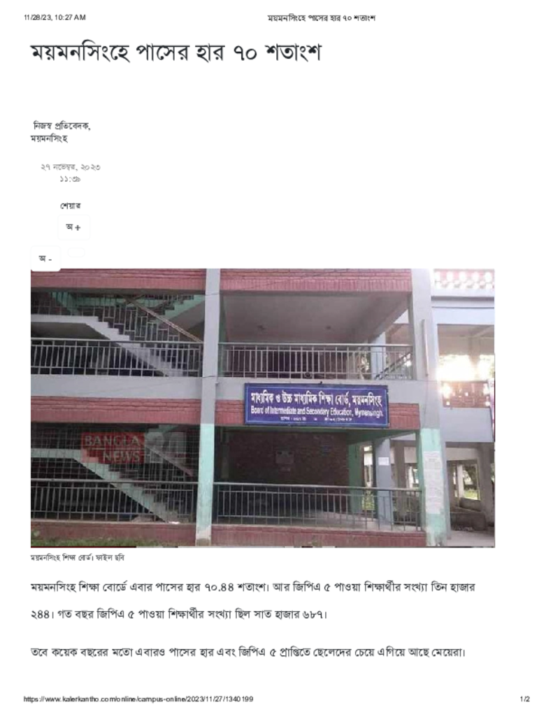 ময়মনসিংহে পাসের হার ৭০ শতাংশ Published on 27 November 2023 Newspaper দৈনিক কালের কন্ঠ Category Public Examination Public Examination HSC Download