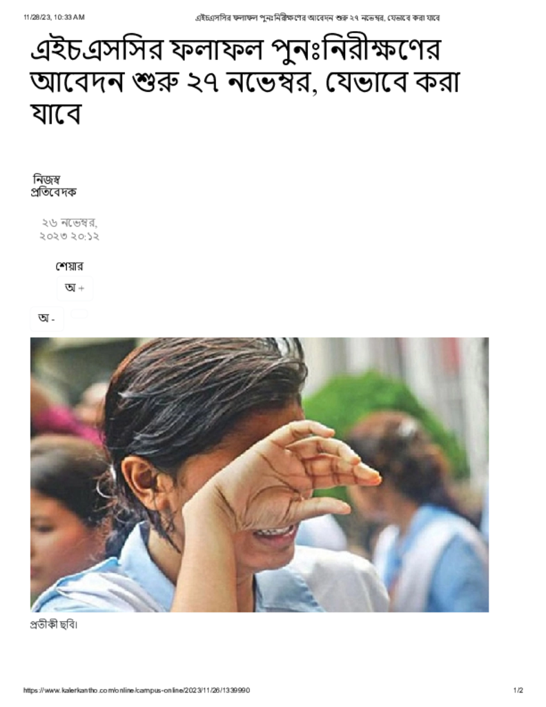 এইচএসসির ফলাফল পুনঃনিরীক্ষণের আবেদন শুরু ২৭ নভেম্বর, যেভাবে করা যাবে Published on 26 November 2023 Newspaper দৈনিক কালের কন্ঠ Category Public Examination Public Examination HSC Download